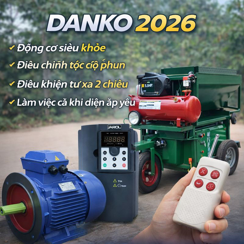 Hệ điều khiển biến tần thông minh: DANKO PRO 2026 sử dụng hệ điều khiển biến tần - bảo vệ toàn diện máy trước các nguy cơ quá tải, quá nhiệt, quá áp - tự động ngắt thông minh khi phát hiện sự cố. Điều chỉnh tốc độ phun theo nhu cầu công việc và theo số lượng thợ làm theo